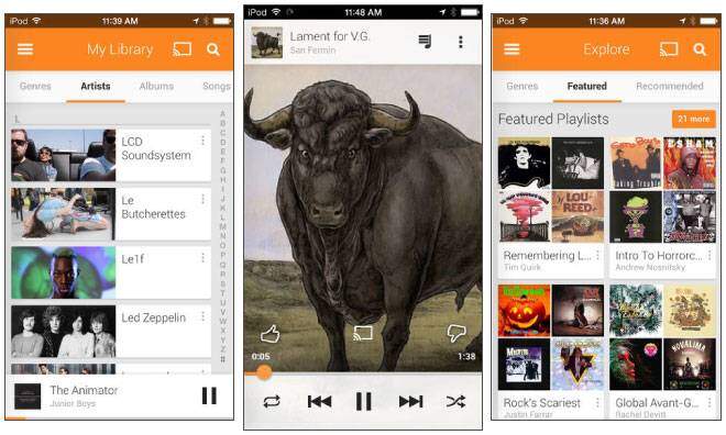 La versione iOS di Google Play Music permette infatti agli utenti di memorizzare o mandare in streaming le proprie librerie musicali o ascoltare tracce dalle maggiori etichette musicali sottoscrivendo un upgrade All-Access dal costo di 9.99 dollari al mese. Gli utenti possono creare inoltre le proprie stazioni radio personalizzate sfruttando qualsiasi traccia o album, o ascoltare una delle stazioni predefinite.