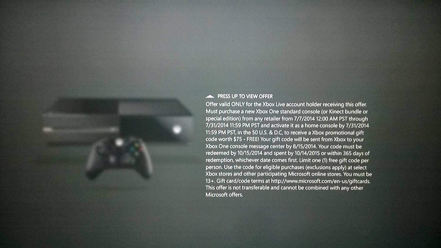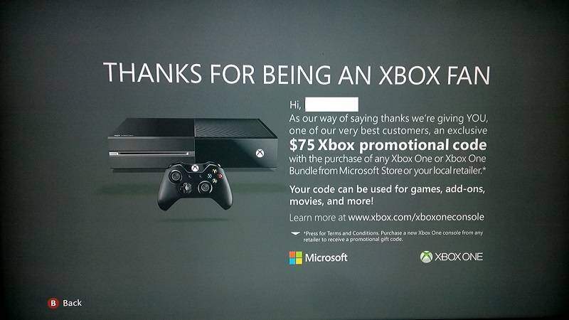 Non siete ancora passati alla next-gen perché avete problemi economici? Niente paura: Microsoft vi regalerà 75 dollari se possedete una Xbox 360 e avete intenzione di comprare una Xbox One. La promozione è stata scoperta da un utente statunitense che lo ha subito segnalato sul forum NeoGAF, dopo che, una volta accesa la console, ha ricevuto un codice promozionale da 75$ per passare alla next-gen. Oltre al piccolo buono, sembra che Microsoft offrirà ai suoi utenti anche la possibilità di ottenere un gioco gratuito e alcuni sconti su altri titoli.