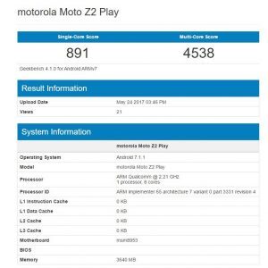 Qualche giorno fa è arrivata la certificazione dal TENAA in Cina (clicca qui se vuoi approfondire l’argomento), ora Moto Z2 Play fa il suo arrivo anche nel database di GeekBench. Uno degli smartphone più attesi di Lenovo tra quelli in programma nel 2017 ha fatto registrare buoni risultati nei benchmark effettuati, in linea con le possibilità che consente lo Snapdragon 625 (non ufficiale, potrebbe alla fine esserci il 626) su cui dovrebbe girare il telefono.Siamo nell’ordine di 891 punti ottenuti in single-core e 4538 in multi-core, un risultato – quest’ultimo – per certi versi anche sorprendente.
