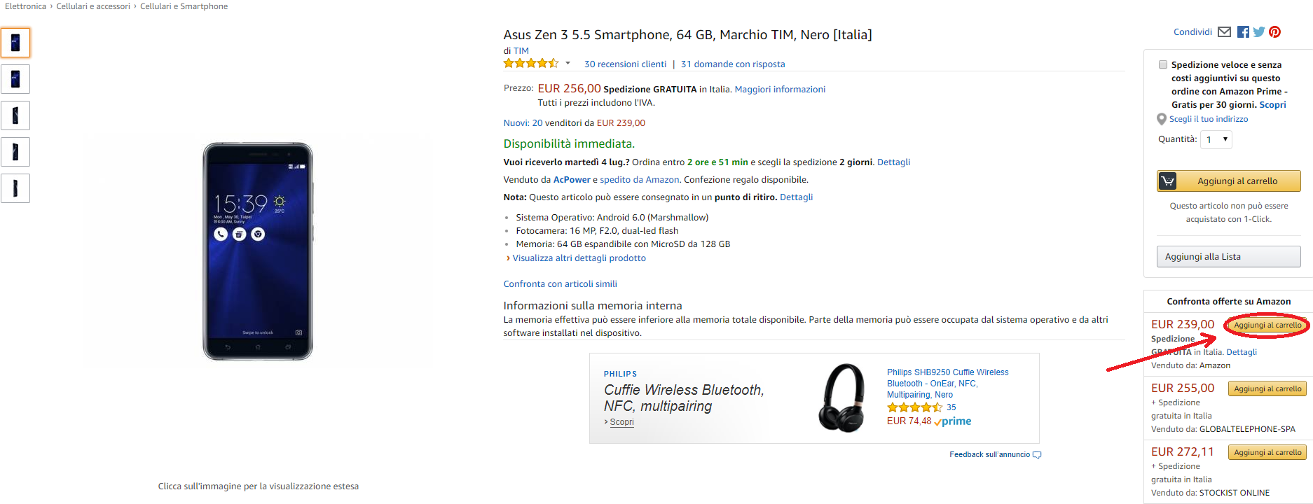 Interessati alla promozione? Asus ZenFone 3 al prezzo di 239 euro sarà disponibile fino a esaurimento scorte. Il prodotto è venduto e spedito da Amazon: comodità e sicurezza 100% garantite. Cliccate sul link seguente per saperne di più: [easyazon_link identifier=”B01MSLHTB9″ locale=”IT” tag=”web051-21″]Asus Zen 3 5.5 Smartphone, 64 GB, Marchio TIM, Nero [Italia][/easyazon_link]