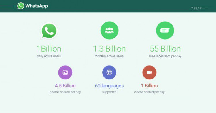 I dati più recenti infatti ci dicono che l’app di messaggistica istantanea può ora contare su più di 1 miliardo di utenti attivi al giorno: solo a febbraio 2016 il team parlava sì di 1 miliardo di utenti attivi, ma su base mensile! Il salto che è stato fatto in poco più di un anno quindi è impressionante. Inoltre sono stati confermati altri dati: gli utenti attivi mensili ammontano a 1.3 miliardi, i messaggi inviati ogni giorno sono 55 miliardi, mentre le foto e i video condivisi mensilmente attraverso la piattaforma sono rispettivamente pari a 4.5 miliardi e 1 miliardo.