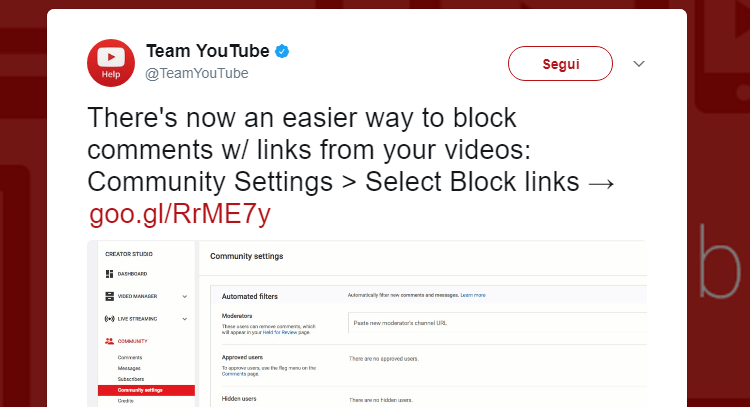 Per usufruire di questa funzionalità bisogna andare nel proprio Creator Studio, aprire l’area Community e cliccare su Links. Si spunta quindi l’opzione, et voilà: da quel momento in poi YouTube notificherà i commenti potenzialmente di spam e permetterà agli youtubers di ripulire i loro spazi ancor prima che vengano inquinati.