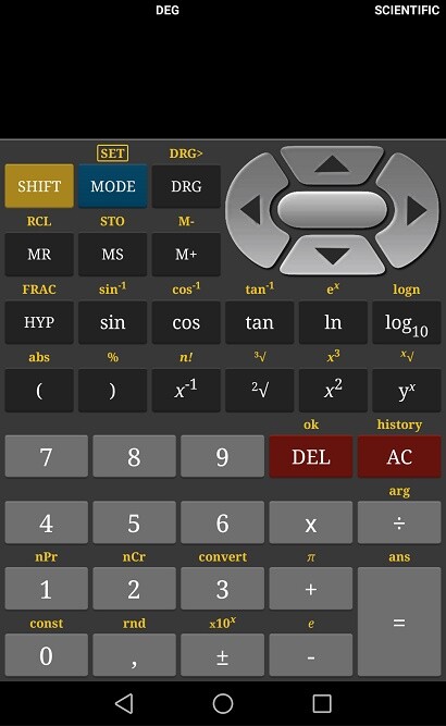 Da notare, inoltre, la presenza, in alto a destra, di quattro frecce direzionali che permettono di muovere agilmente il cursore. Questa funzione si rivela particolarmente utile quando si sta effettuando un calcolo particolarmente complesso che comporta l’utilizzo di molte funzioni in serie. Con il tasto “MODE”, inoltre, è possibile modificare l’interfaccia dell’app passando dalla versione scientifica ad una versione basilare dell’app o ancora attivando le funzioni più complesse come Matrice, Equazione e Grafico.