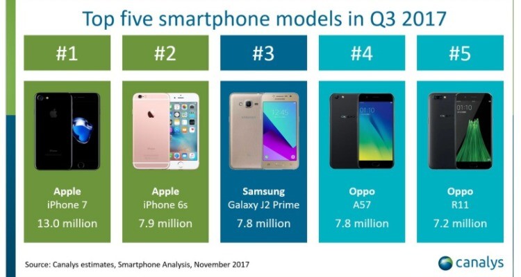 Sicuramente il primo posto di iPhone 7 è il dato meno sconcertante venuto fuori dalla classifica di Canalys. Al secondo posto, infatti, troviamo iPhone 6S ossia uno smartphone vecchio di due anni mentre al terzo posto si posiziona un entry level come Samsung Galaxy J2 Prime.