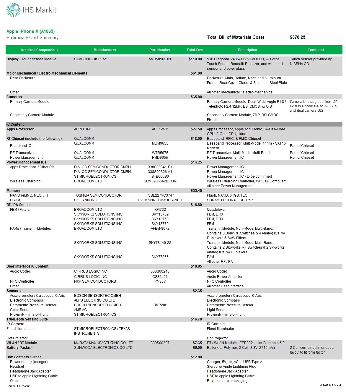 Ecco il report completo di IHS Markit sui costi dei vari componenti del nuovo iPhone X.