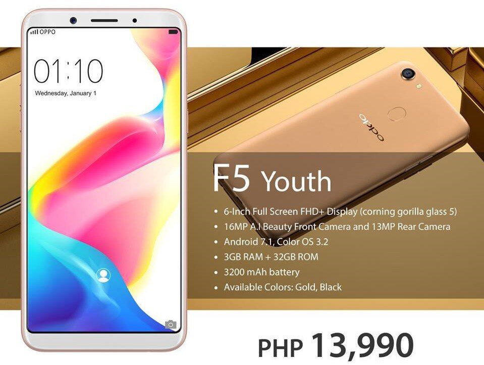 Oppo F5 Youth è praticamente identico al predecessore per quanto riguarda il comparto fotografico, composto da un obiettivo posteriore da 13 MP (apertura focale f/2.2 e flash LED) e uno anteriore da 16 MP (apertura f/2.0). A livello software da segnalare la funzionalità, basata su intelligenza artificiale, che consente di migliorare le imperfezioni presenti sul viso (saranno felicissimi gli amanti dei selfie). Detto della batteria da 3.200 mAh, da segnalare che Oppo F5 Youth arriva con Android Nougat 7.1 con interfaccia personalizzata ColorOS 3.2 e che sarà disponibile nelle colorazioni oro o nero a circa 230 euro (lancio per ora limitato alle Filippine).