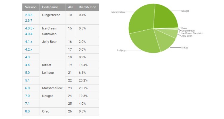 Uno smartphone Android su quattro in circolazione è dotato ancora di Android Lollipop (20,2% per Android 5.1 e 6,1% per Android 5.0), mentre a seguire troviamo tutte le vecchie distribuzioni Android che si spartiscono il restante 20% della “torta”. Da notare come in questo momento Android 8.0 Oreo abbia lo stesso market share di Android Ice Cream Sandwich.