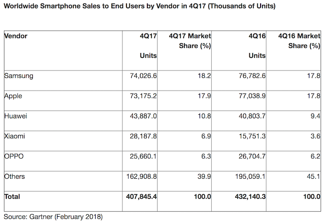 La società di ricerche di mercato Gartner ha pubblicato nelle scorse ore un rapporto che conferma quello previsto e annunciato in precedenza da altre società: nel nel Q4 2017 le vendite di smartphone non sono state poi così eccezionali come si poteva ipotizzare (in particolare c’erano molte attese nei confronti di iPhone X). Invece, nel Q4 2017 sono diminuite le vendite di smartphone rispetto allo stesso periodo del 2016.