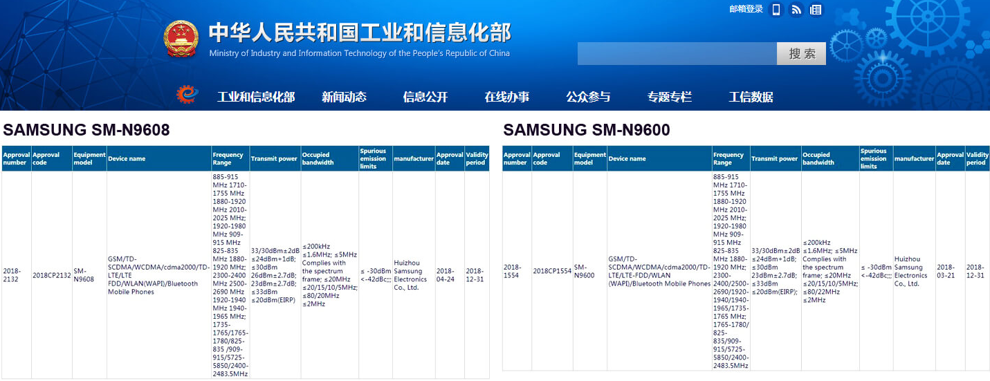 La certificazione intanto riguarda la compatibilità con gli standard wireless cinesi e ci conferma una volta di più l’esistenza di due versioni: sono infatti comparsi i modelli SM-N9600 (certificazione avvenuta il 21 Marzo 2018) e SM-N9608 (quest’ultimo segnalato la scorsa settimana, il 24 Aprile 2018).