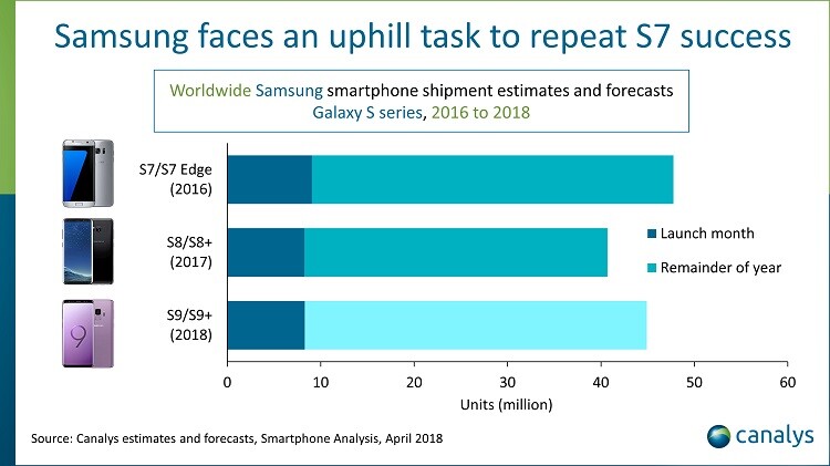 C’è da segnalare anche che secondo Canalys si supereranno i 40 milioni di Samsung Galaxy S9 e S9 Plus spediti, superando quindi i risultati ottenuti dall’S8.