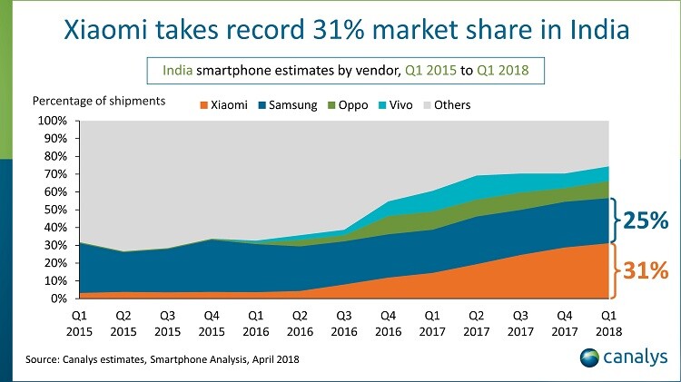 In India, però, Xiaomi è irresistibile. In tre anni la situazione si è completamente ribaltata, con Samsung costretta a passare dal 33% della quota di mercato detenuta nel Q1 2015 al sorpasso subito nel Q1 2018. La ricerca è stata condotta da Canalys e nella tabella in alto si può ammirare la crescita graduale e costante di Xiaomi.