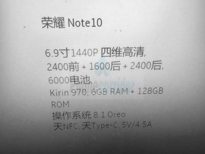 Il principale elemento della scheda tecnica del nuovo Honor Note 10 sarà il display. Lo smartphone avrà un display da ben 6.9 pollici di diagonale con risoluzione di 1440p. Il display non dovrebbe avere il notch ma un rapporto tra le dimensioni di 18:9. A gestire il funzionamento del device ci sarà il SoC Kirin 970 supportato da 6 GB di memoria RAM e 128 GB di storage interno. Questa dovrebbe essere l’unica configurazione con cui il device arriverà sul mercato.