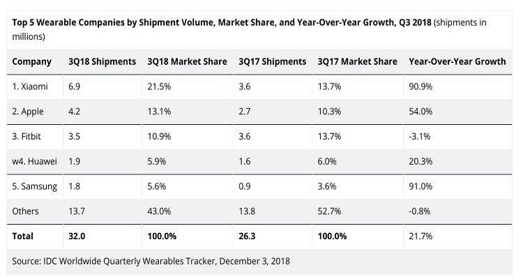 L’azienda cinese ha puntato forte sulla sua nuova smartband, la Xiaomi Mi Band 3, che ha riscosso un enorme successo (costa, lo ricordiamo, attorno ai 25 euro). Il risultato è una crescita delle spedizioni di oltre il 90% (da 3.6 a 6.9 milioni di unità) e una quota di mercato che è salita dal 13.7 al 21.5%.