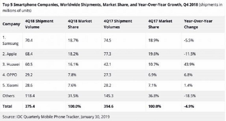 Partiamo dai numeri generali: sono stati spediti 375.4 milioni di smartphone contro i 394.6 milioni dello stesso periodo nel 2017. Ciò significa un pesante -4.9% che si va ad aggiungere ai già citati trimestri precedenti in negativo per un complessivo -4.1% del 2018 rispetto all’anno anteriore. Tra l’altro sono dati che non sono neppure destinati a migliorare nel breve periodo, almeno stando ai report di Trendforce che prevedono un clamoroso -10% nel Q1 2019 sempre su base annua.