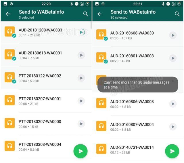 A supporto dei più “pigri” (ovvero quasi tutti noi utenti comuni di WhatsApp) ci sarà anche la possibilità di visualizzare un’immagine di anteprima, a patto ovviamente che ve ne sia una associata alla traccia audio. L’altra grande aggiunta è l’invio di un massimo di 30 messaggi per volta, un passaggio che già anni fa si rese necessario per le immagini da condividere.