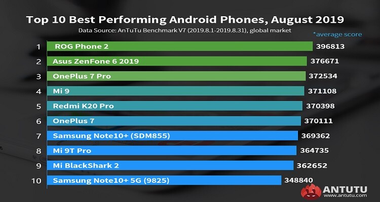Fatta eccezione del Samsung Galaxy Note 10+ 5G equipaggiato con Exynos 9825 e che compare al decimo posto, il resto della top ten è racchiuso in una manciata di punti: ai due Asus si aggiunge sul podio OnePlus 7 Pro, mentre seguono due smartphone firmati Xiaomi: il Mi 9 e il Redmi K20 Pro.