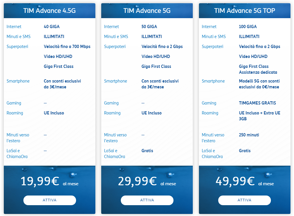 Partiamo dalla prima, ‘TIM Advance 4.5G‘. Quest’ultima, a 19,99€ al mese, offre chiamate ed SMS illimitati nonché 40 Gigabite di connessione a 4,5G. Il vantaggio rispetto alle altre due è che non è necessario abbonarsi e pagare su pre-pagate o carte di credito ma puoi utilizzare il credito residuo come una normale prepagata. ‘TIM Advance 5G‘ costa 10€ in più (quindi 29,99€) ma, oltre ad avere SMS e chiamate senza limiti, offre 50 GigaByte in 5G e, inclusi nel prezzo, i servizi ‘LoSai e ChiamaOra‘. Il terzo e ultimo pacchetto di ‘TIM Advance’, chiamato ‘TIM Advance 5G Top‘ costa 49,99€. Se pensi che sia tanto, allora devi leggere cosa avrai: SMS e chiamate senza limiti, 100 GigaByte di connessione 5G, i servizi ‘LoSai e ChiamaOra’, smartphone incluso nel prezzo, 250 minuti di chiamate verso l’estero con 3 GigaByte di roaming extra UE. Tutto qui? No! Fino al 31 dicembre 2019 avrai gratis ‘TIMGames‘.