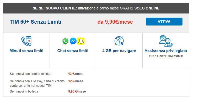 Chiudiamo, infine, con TIM60+ dedicata, come puoi immaginare, per chi ha almeno 60 anni. Il costo varia a seconda della modalità di attivazione: da 9,90€ al mese se il pagamento viene effettuato tramite bolletta, 13€ al mese se paghi con il credito residuo e 12€, sempre mensili, se rinnovi ogni mese con TIM Pay, carta di credito, conto corrente nei negozi TIM. Indipendentemente dalla modalità di attivazione, include 4GigaBye, chiamate illimitate, servizi di chat online gratis, assistenza privilegiata 119 e Doctor TIM Mobile.
