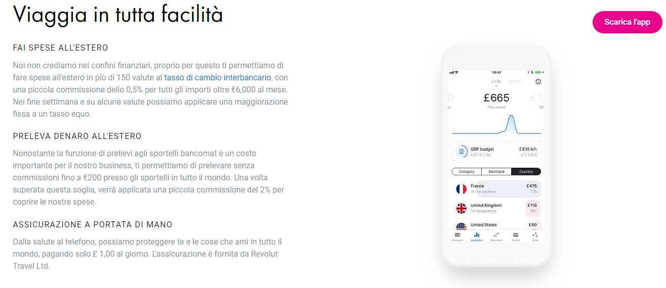 Puoi stipulare assicurazioni – compresi sulla salute – pagando £ 1,00 al giorno sfruttando i servizi della Revolut Travel Ltd. Nessun problema nemmeno per il trasferimento di denaro: pagando una commissione dello 0,5% per gli importi che superano i 6mila euro al mese, puoi trasferire denaro in 29 valute diverse e con un click puoi richiedere soldi dal tuo conto. Hai delle spese fisse? Attiva il servizio di pagamento ricorrente e nel giorno e nel mese indicato automaticamente effettuerai il pagamento desiderato.