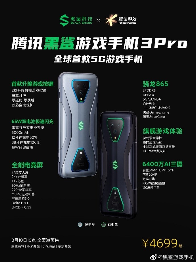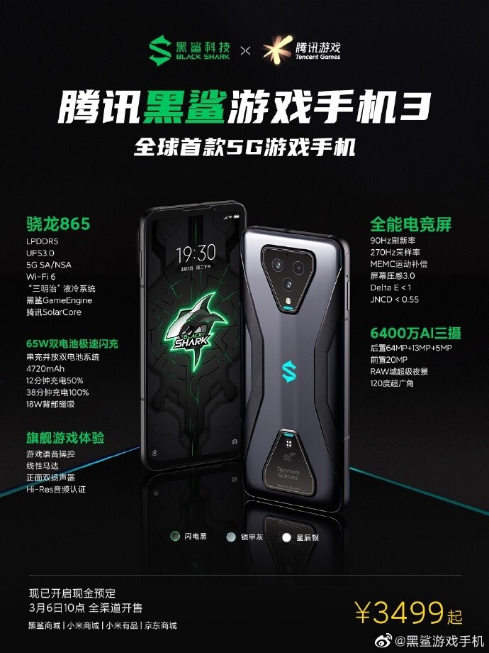 Black Shark 3 arriva con un display AMOLED da 6.67 pollici con risoluzione in Full HD+ e frequenza d’aggiornamento a 90 Hz; la diagonale sale a 7.1″ sulla versione Pro. Sotto la scocca trova spazio lo Snapdragon 865 di Qualcomm, accompagnato da 8/12 GB di memoria RAM (LPDDR5) e 128/256 GB di storage interno (di tipo UFS 3.0, il 3 Pro è disponibile solo col taglio maggiore). Da segnalare l’ormai tradizionale sistema di raffreddamento a liquido che permetterà di abbassare le temperature anche in caso di sessioni più impegnative.