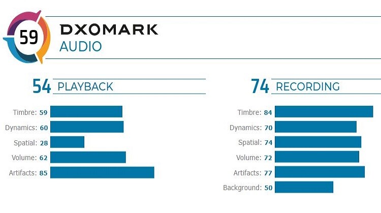 A pesare in modo deciso sul giudizio finale è soprattutto la riproduzione audio che ha ottenuto un punteggio bassissimo, 54 punti. La presenza di un unico speaker, le tonalità basse insufficiente e i volumi elevati in sofferenza a causa della compressione ben oltre il dovuto sono le cause di una valutazione così insufficiente. Per contro, la registrazione ha ottenuto 74 punti (tra i risultati più alti in assoluto) ma non è servita ad alzare granché la media.