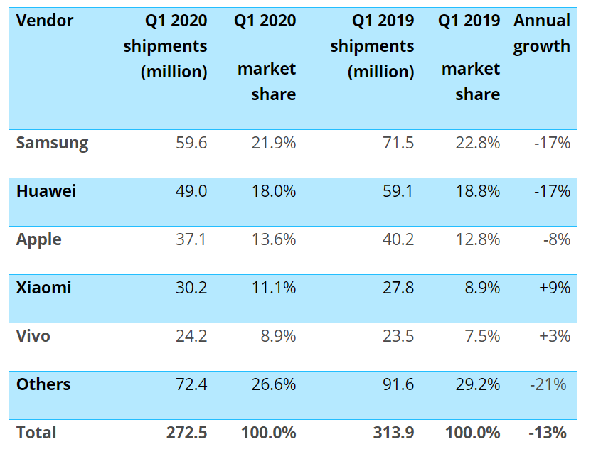 Vendite smartphone in calo per Samsung, Huawei e Apple nel primo trimestre del 2020, cresce Xiaomi
