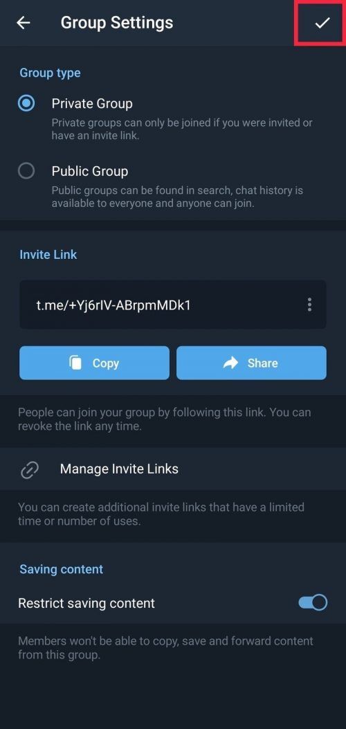 Non lasciare che il tuo contatto usi il tuo ingegno e condividi i tuoi meme originali in altri gruppi o canali di Telegram. Puoi impedire ai membri del gruppo/canale di salvare o inoltrare contenuti su Telegram. Ecco come: