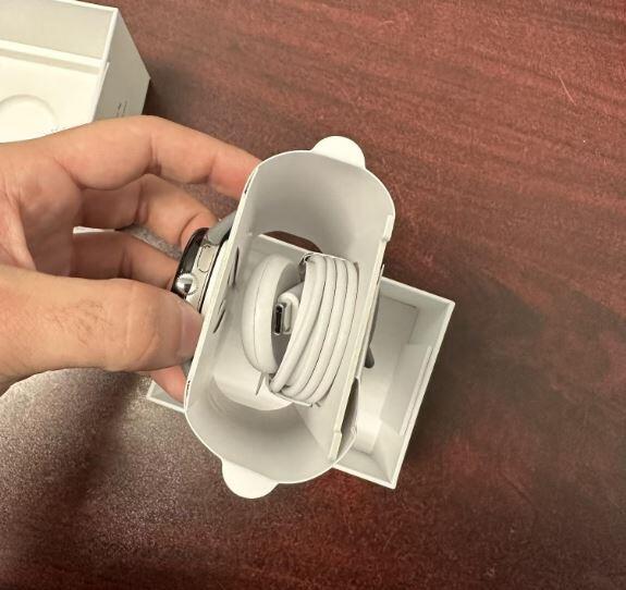 A differenza del Galaxy Watch 5, Pixel Watch viene fornito in una scatola rettangolare con il cinturino agganciato e avvolto attorno a un inserto invece di essere piatto e lungo.