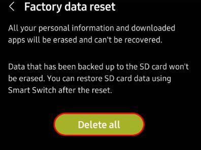 - Nella successiva pagina di ripristino dei dati di fabbrica , tocca il pulsante Elimina tutto per avviare il processo di ripristino dei dati di fabbrica.