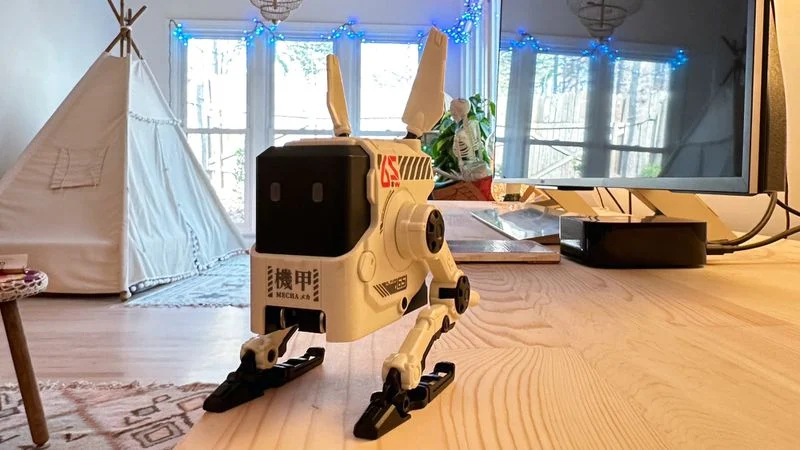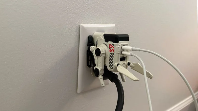 Il caricabatterie ha all’incirca le dimensioni di un caricabatterie standard da 65 W, ma ha una spina di alimentazione nella parte inferiore, due gambe mobili e pieghevoli e antenne rimovibili. Ci sono due occhi che si illuminano quando è collegato, e i piedi si ripiegano.