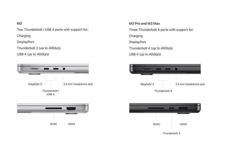 Il nuovo MacBook Pro M3 da 14 pollici di Apple è dotato di due porte USB-C Thunderbolt 3, non tre porte Thunderbolt 4 come i modelli MacBook Pro da 14 e 16 pollici alimentati dai chip M3 Pro e M3 Max.